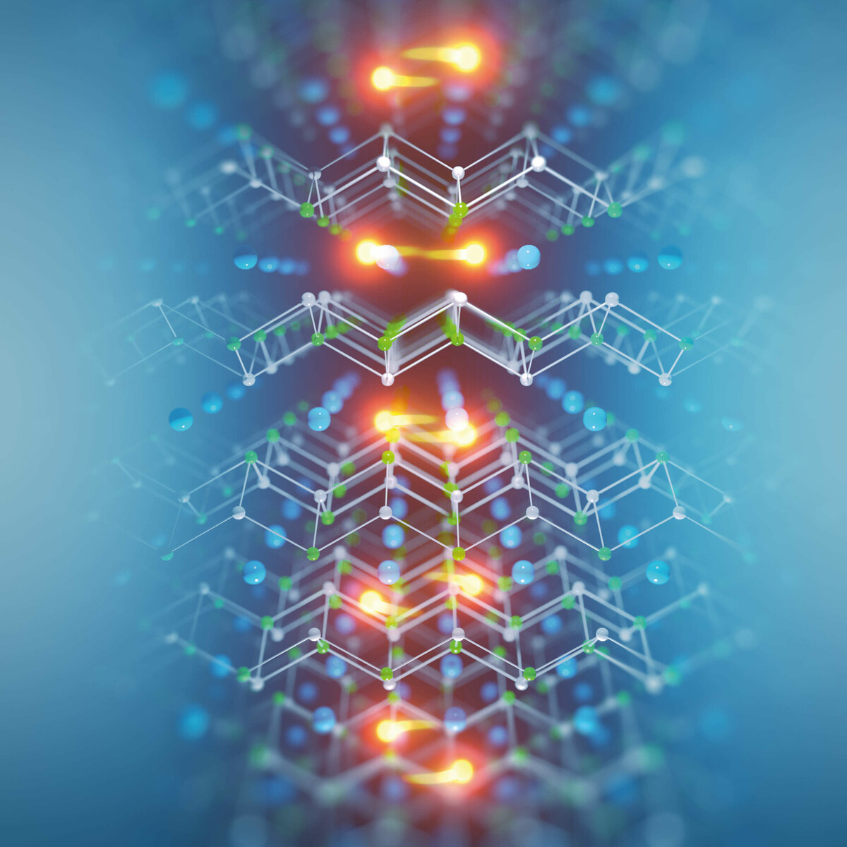 Die Abbildung zeigt das außergewöhnlich robuste Quantenmaterial Cer-Rhodium-Arsen (CeRh2As2), das Elena Hassinger im Exzellenzcluster ct.qmat erforscht. Zwischen den Cer-Atomen (blau) befinden sich Cooper-Paare (gelb). Diese entstehen bei sehr tiefen Temperaturen aus jeweils zwei Elektronen und sind eine Voraussetzung für Supraleitung. Sie können im Kollektiv einen Quantenzustand bilden und sich als elektrischer Strom widerstandsfrei durch den Supraleiter bewegen.