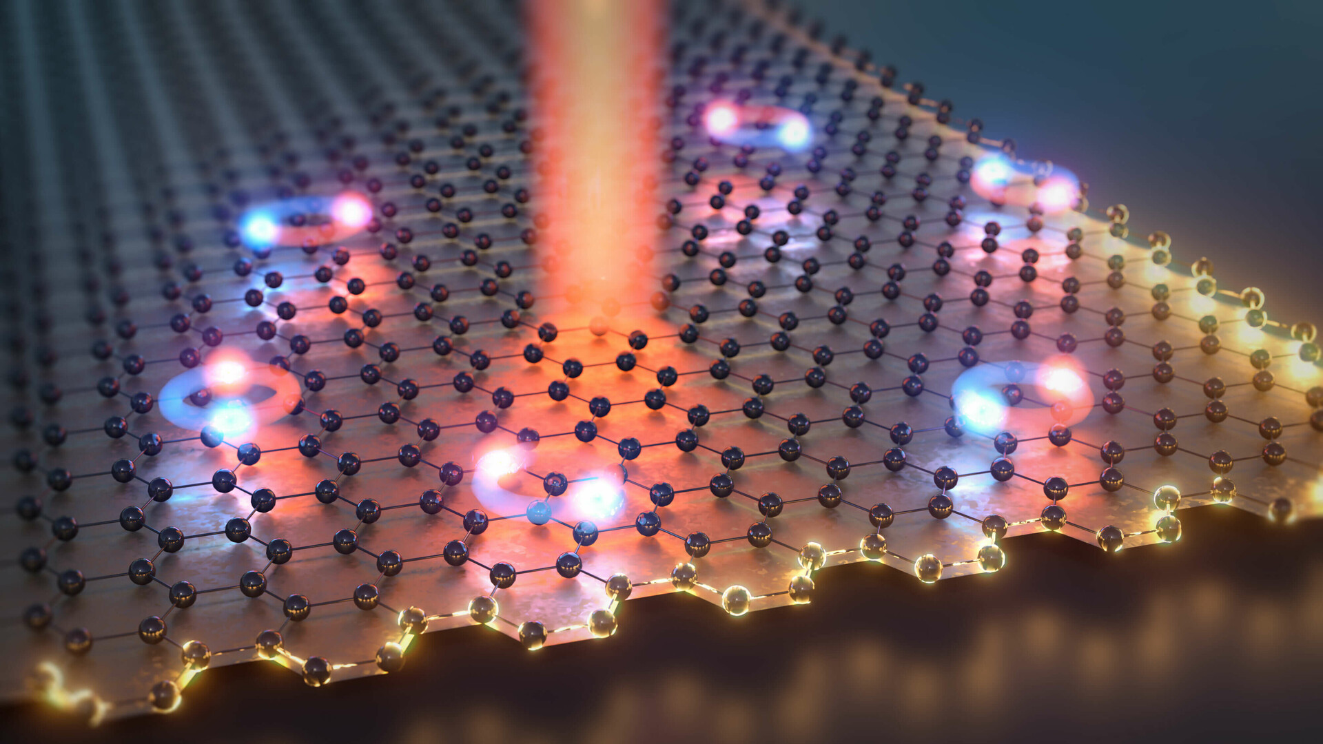 Drei Exzitonen (Elektron-Loch-Paare) auf dem topologischen Isolator Bismuten. Durch die bienenwabenförmige Atomstruktur fließen die Elektronen nur am Rand des Materials. Dieser topologische Effekt ermöglicht einen Stromfluss ohne Widerstand. Erstmals konnten ct.qmat-Forscher:innen Exzitonen in einem topologischen Isolator erzeugen. Dies schafft die Grundlagen für neuartige optoelektronische Bauelemente und vielleicht sogar für die Realisierung von Qubits.