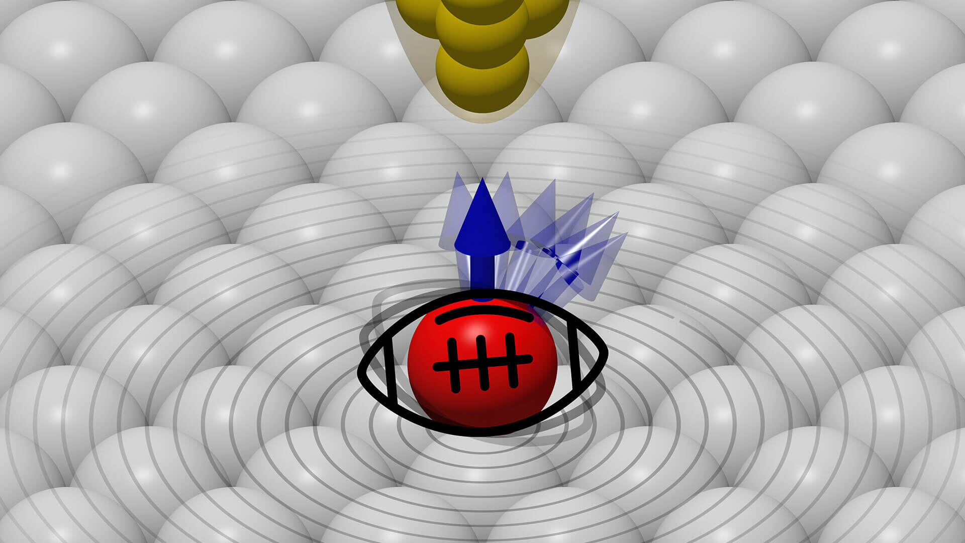 Das Kobalt-Atom (rot) hat ein magnetisches Moment („Spin“, als blauer Pfeil ), das sich durch ein externes Magnetfeld immer wieder anders orientiert (von Spin-up zu Spin-down). Dadurch regt das magnetische Atom die Elektronen der Kupfer-Oberfläche (grau) zur Schwingung an (Wellen). Dies konnten die Physiker des Würzburg-Dresdner Exzellenzclusters ct.qmat nur messen, weil sie eine Eisenspitze auf das Rastertunnelmikroskop setzten (gelb).
