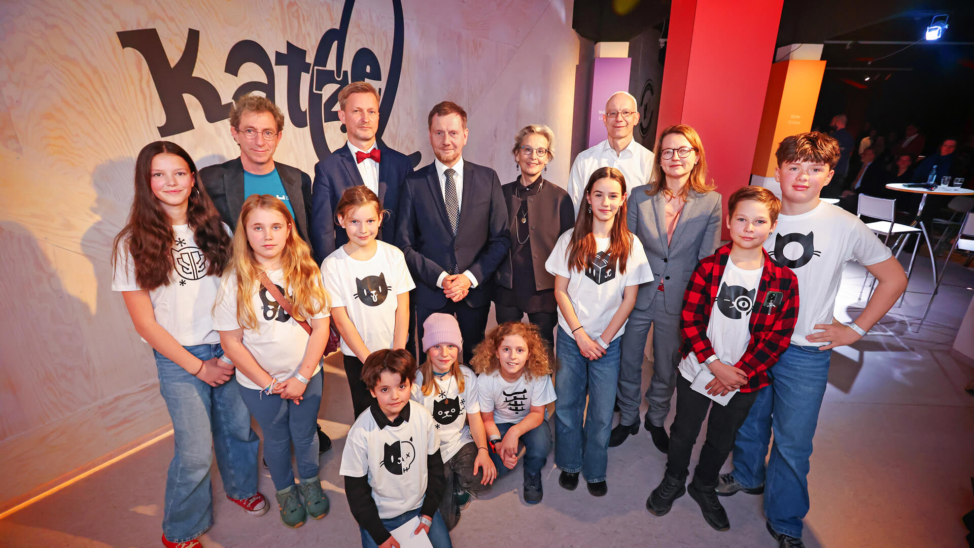Am 25. April 2025 wurde der Escape Room „Katze Q – Ein Quanten-Adventure“ des Dresden-Würzburger Exzellenzclusters ct.qmat in den Technischen Sammlungen Dresden eröffnet – der erste Escape Room zur Quantenphysik für Kinder und Jugendliche in Deutschland. Der sächsische Ministerpräsident und Schirmherr des Projekts, Michael Kretschmer, gehörte gemeinsam mit Kindern der Universitätsschule Dresden zu den ersten Gästen. Hinten v.l.n.r.: Roland Schwarz, Direktor der Technischen Sammlungen Dresden, Dr. Andreas Handschuh, Staatssekretär des Sächsischen Staatsministeriums für Wissenschaft, Kultur und Tourismus, Michael Kretschmer, Ministerpräsident des Freistaates Sachsen und Schirmherr des Projekts, Professorin Ursula M. Staudinger, Rektorin der TU Dresden, Professor Matthias Vojta, Dresdner ct.qmat-Sprecher und Annekatrin Klepsch, Bürgermeisterin für Kultur, Wissenschaft und Tourismus der Landeshauptstadt Dresden. Foto: Amac Garbe