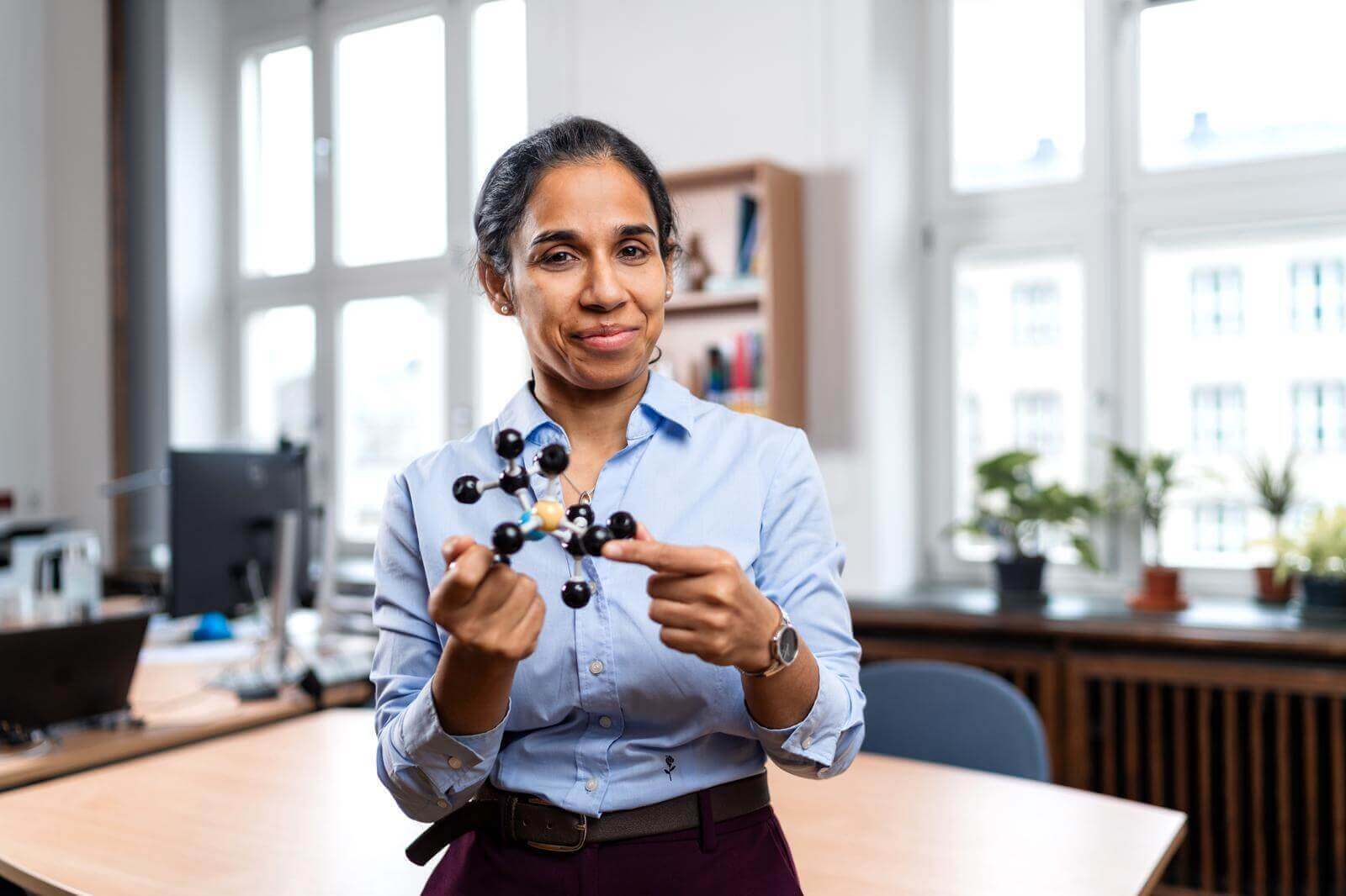 Aparajita Singha kann einzelne magnetische Momente in Quantenmaterialien messen – eine wichtige Grundlage für zukünftige Quantentechnologien. Ihre Professur für „Nanoskalige Quantenmaterialien“ des Würzburg-Dresdner Exzellenzclusters ctd.qmat ist jetzt an der TU Dresden gestartet. Die Fotos zeigen Singha in ihrem Labor sowie im Büro mit dem Modell eines Diamantgitters bzw. eines NV-Zentrums in der Hand.