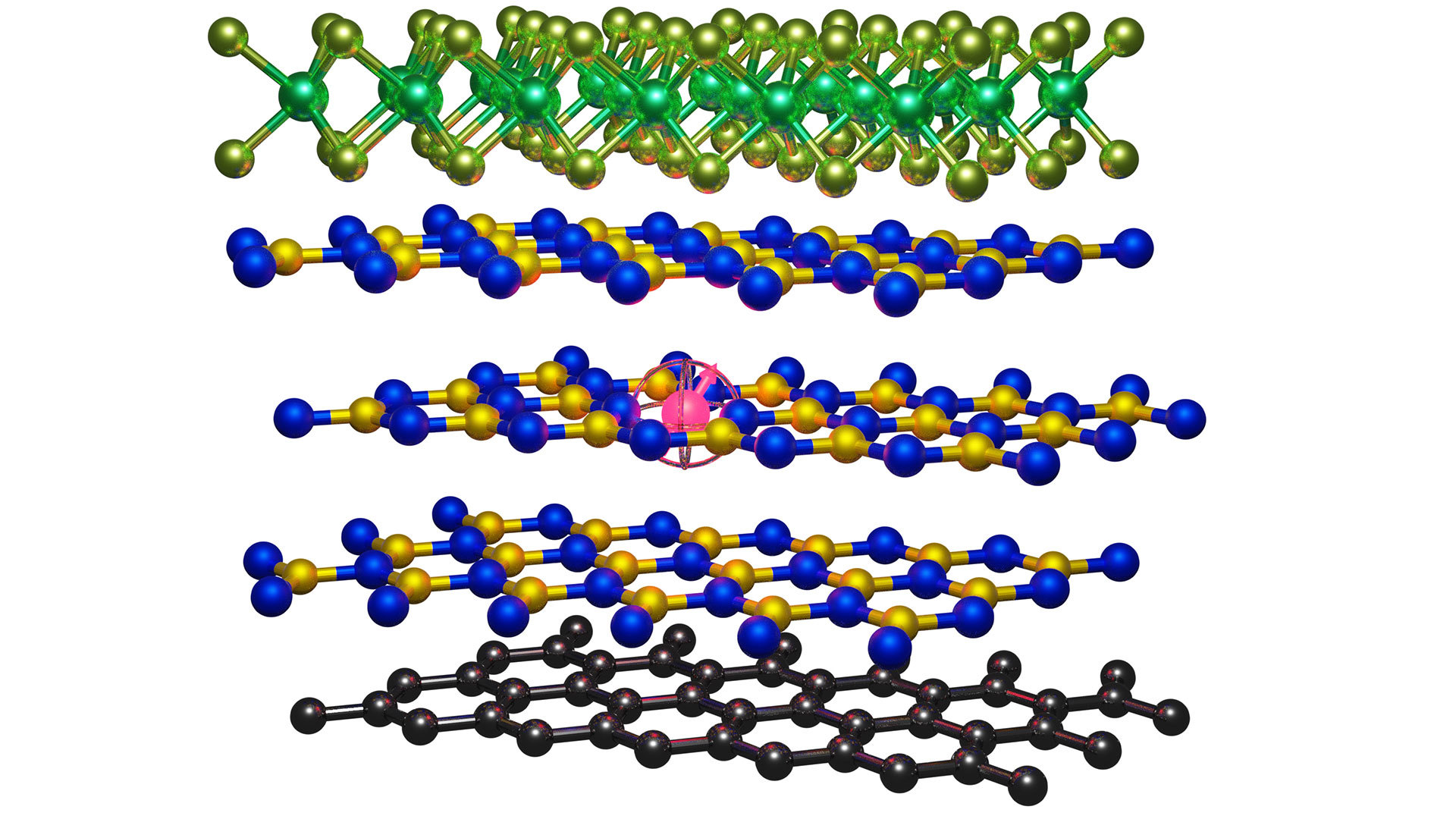 The researchers plan to realize such a stacked structure. It consists of metallic graphene (bottom), insulating boron nitride (middle) and semiconducting molybdenum disulfide (top). The red dot symbolizes the single spin defect in one of the boron nitride layers. The defect can serve as a local probe in the stack. (Image: Andreas Gottscholl / University of Wuerzburg)
