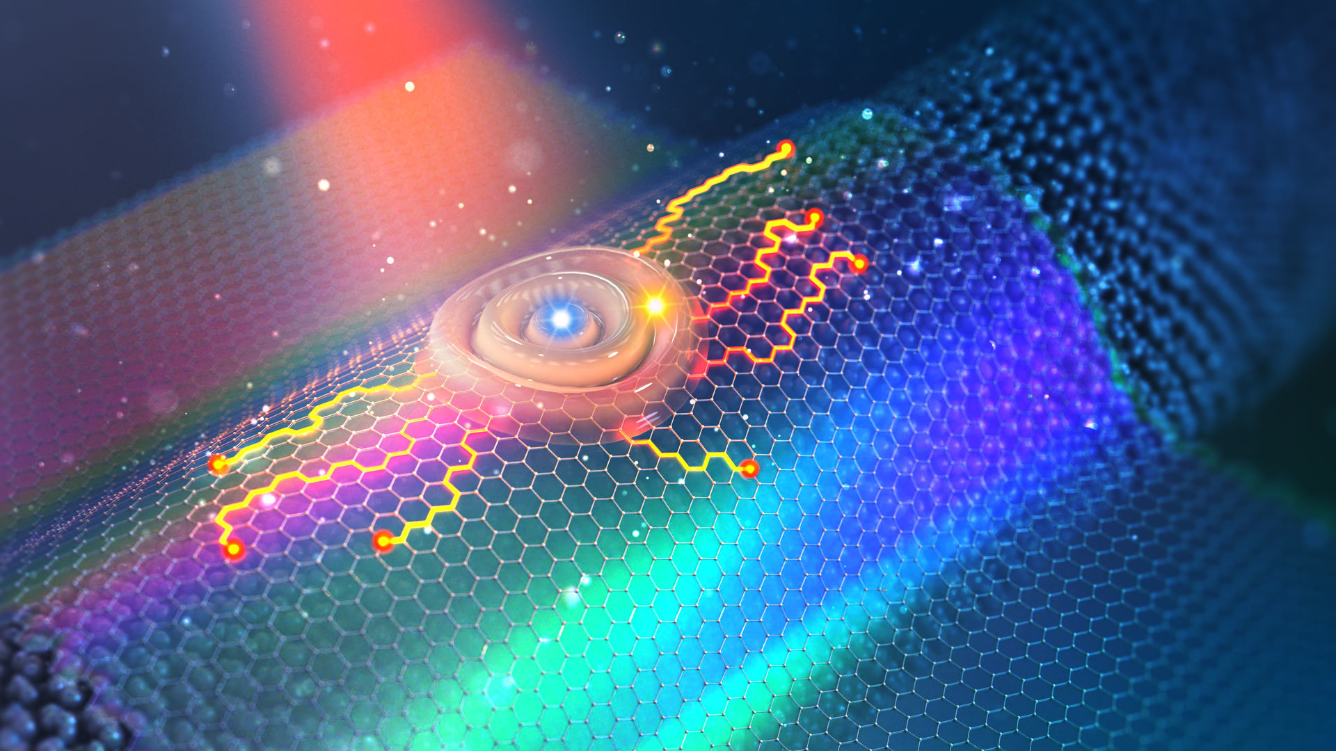 Illustration of an atomically-thin material layer stretched over a nanowire. It creates an energy channel for electronic quasiparticles, excited by light and guided along the channel. Their movement is made visible by ultrafast microscopy. © Jörg Bandmann/ct.qmat