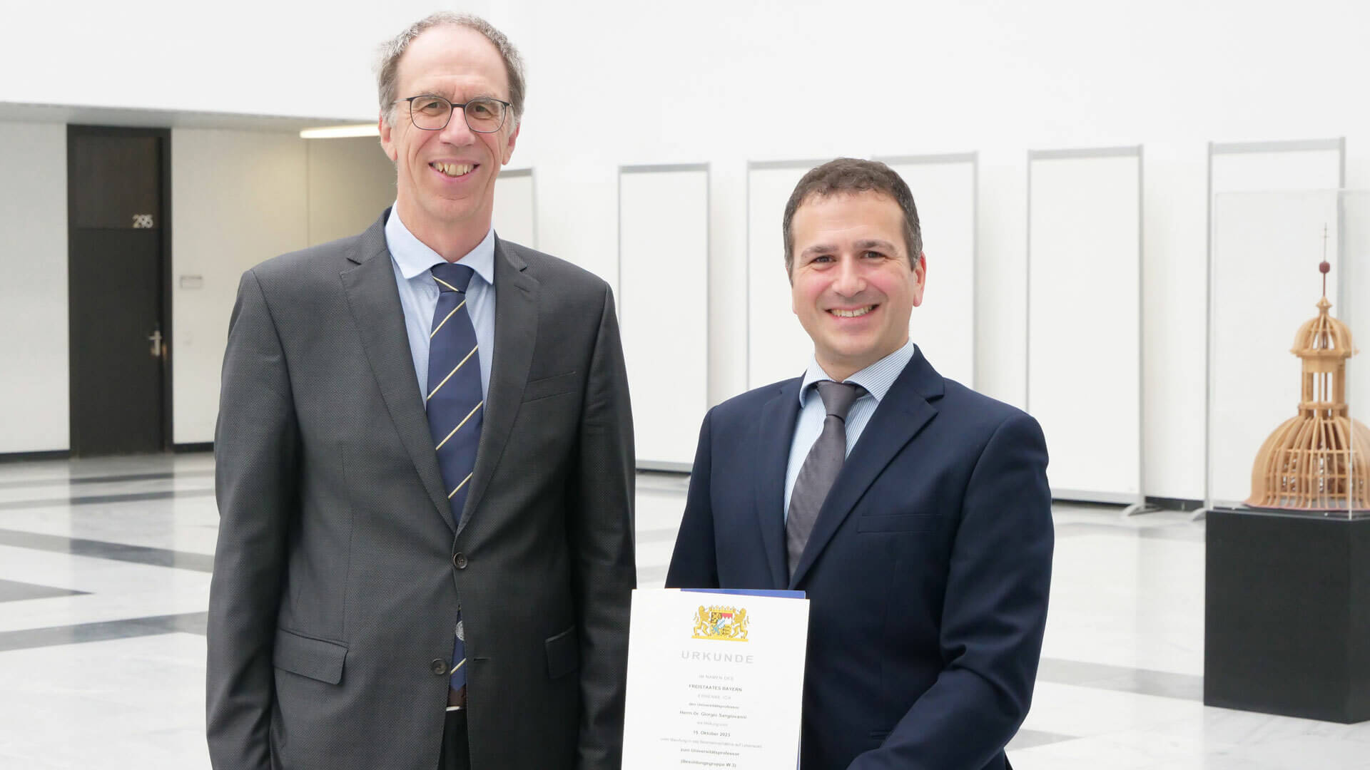 Giorgio Sangiovanni (right) is a newly appointed professor at the Würzburg-Dresden Cluster of Excellence ct.qmat. He proudly displays the appointment certificate he received from Professor Paul Pauli, president of JMU Würzburg, on 10 October 2023.