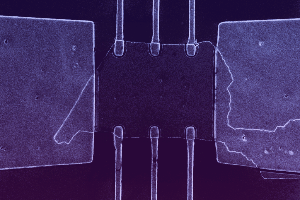 Scanning electron microscope image of an exfoliated PtBi₂ nanostructure. The contacts are visible in lighter colors. The two contacts on the right and left are used to inject and collect the current respectively, while the thin contacts are used to measure voltage. The distance between the current contacts is 50 microns.